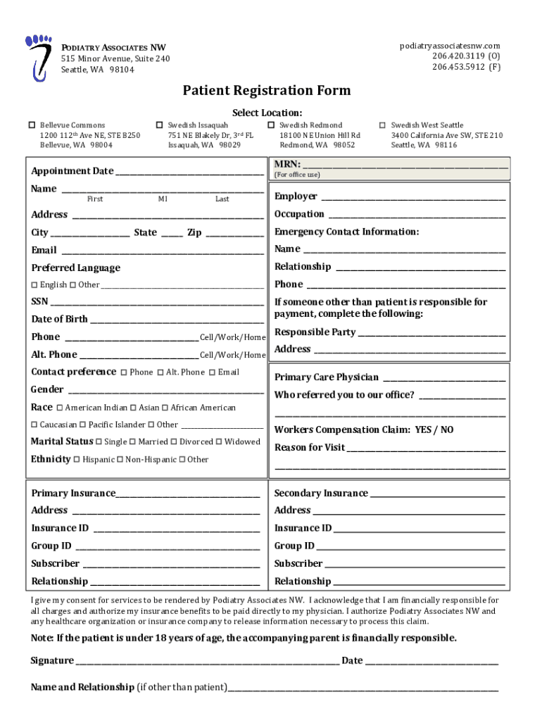 Podiatryassociatesnw.com 206.420.3119 (O) 206.453.5912 (F)PODIATRY ASSOCIATES NW515 Minor Avenue, Suite 240 Seattle, WA 98104Patient Registration Form Select Location: Bellevue Commons Swedish Issaquah1200