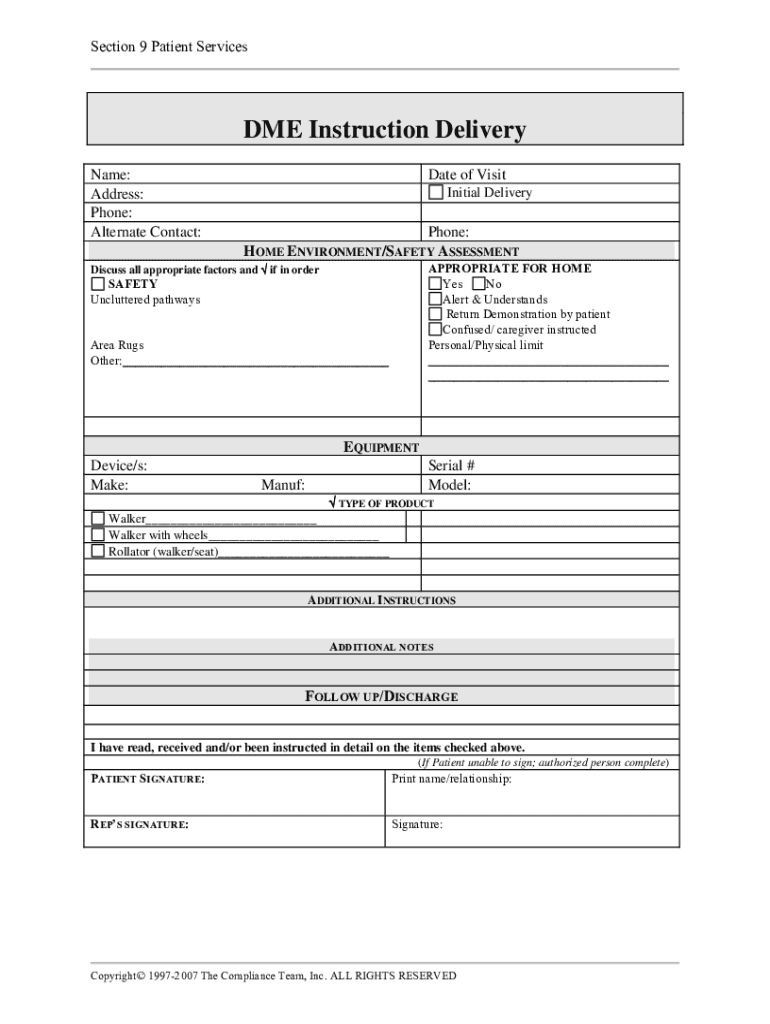 Section 9 Patient Services DME Instruction Delivery Name: Address: Phone: Alternate Contact:Date of Visit Initial DeliveryPhone: HOME ENVIRONMENT/SAFETY ASSESSMENT APPROPRIATE FOR HOME Yes No Alert
