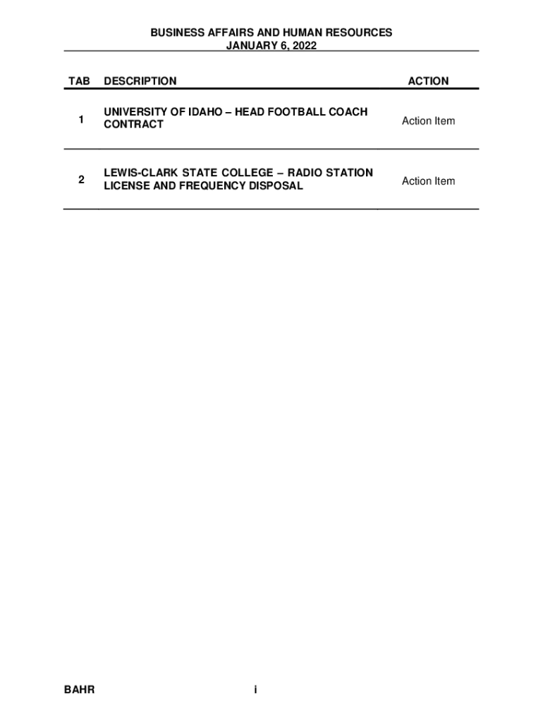 BUSINESS AFFAIRS AND HUMAN RESOURCES JANUARY 6, 2022 TABDESCRIPTIONACTION1UNIVERSITY OF IDAHO HEAD FOOTBALL COACH Contraction Item2LEWISCLARK STATE COLLEGE RADIO STATION LICENSE AND FREQUENCY DISPOSALAction