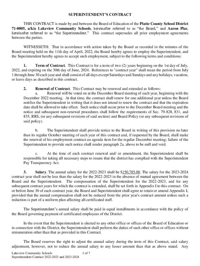 SUPERINTENDENTS CONTRACT THIS CONTRACT is made by and between the Board of Education of the Platte County School District 710005, a/k/a Lake view Community Schools, hereinafter referred to as the