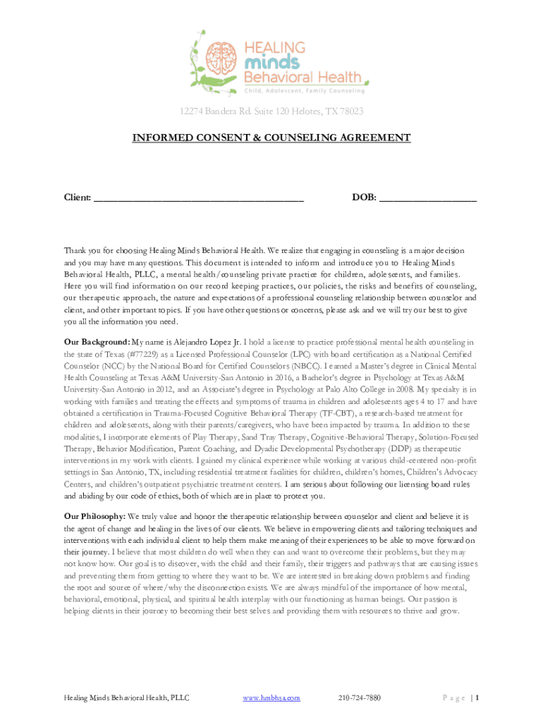 12274 Band era Rd. Suite 120 Helots, TX 78023INFORMED CONSENT & COUNSELING AGREEMENTClient: ___DOB: ___Thank you for choosing Healing Minds Behavioral Health. We realize that engaging in counseling