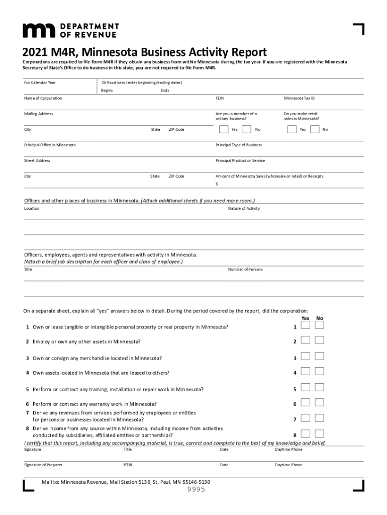 2021 M4R, Minnesota Business Activity ReportCorporations are required to file Form M4R if they obtain any business from within Minnesota during the tax year. If you are registered with the Minnesota