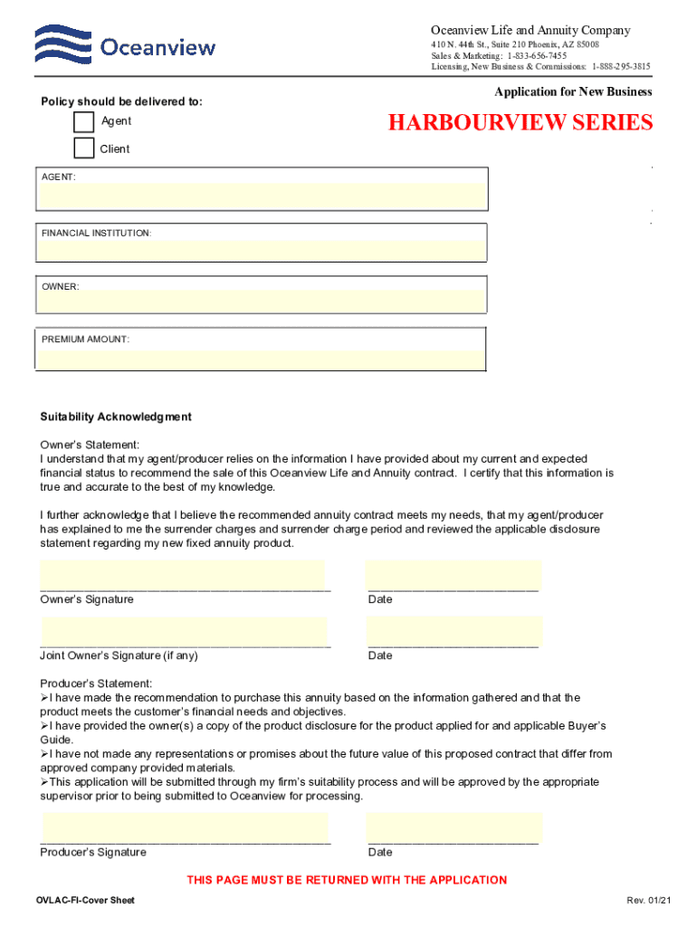 Ocean view Life and Annuity Company BUSINESS APPLICATION CHECKLIST: WYOMING Individual Single Premium Deferred Annuity Application (Form Code: ICC OLA SPAATZ) NOTE: Required Harbourview MultiYear