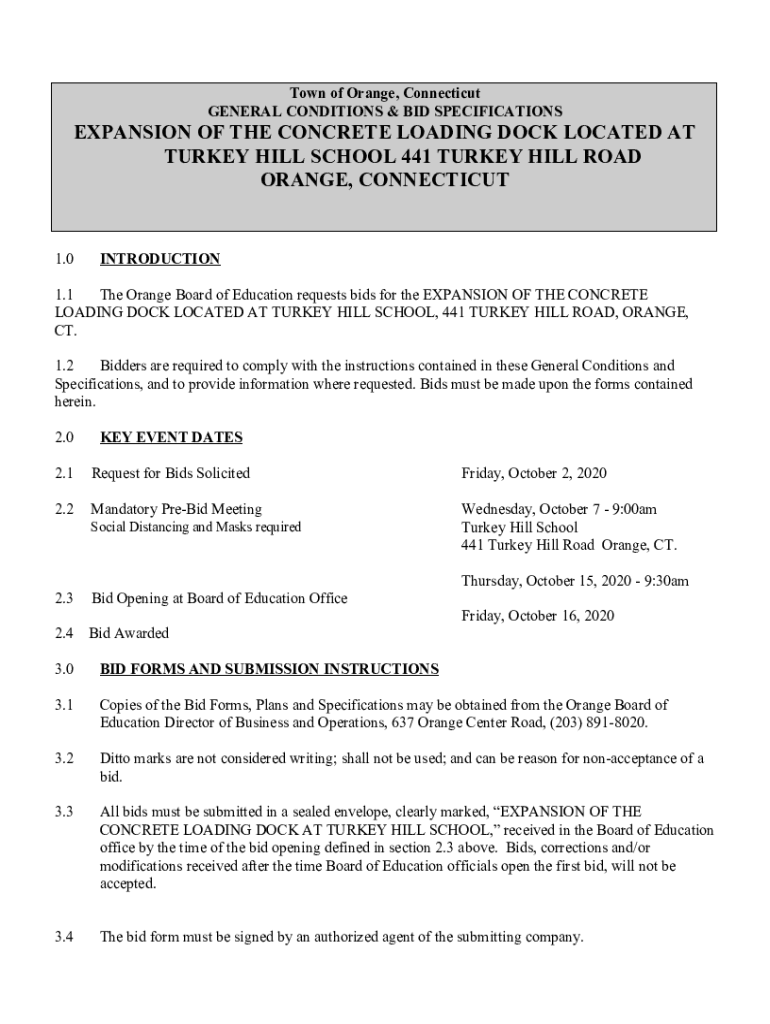Town of Orange, Connecticut GENERAL CONDITIONS & BID SPECIFICATIONSEXPANSION OF THE CONCRETE LOADING DOCK LOCATED AT TURKEY HILL SCHOOL 441 TURKEY HILL ROAD ORANGE, CONNECTICUT1.0INTRODUCTION1.1 The