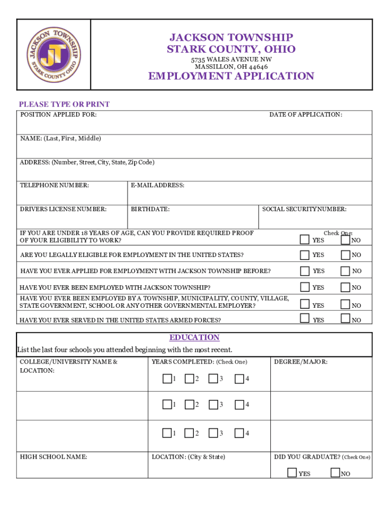 JACKSON TOWNSHIP STARK COUNTY, OHIO 5735 WALES AVENUE NW RASSILON, OH 44646EMPLOYMENT APPLICATION PLEASE TYPE OR PRINT POSITION APPLIED FOR:DATE OF APPLICATION:NAME: (Last, First, Middle)ADDRESS:
