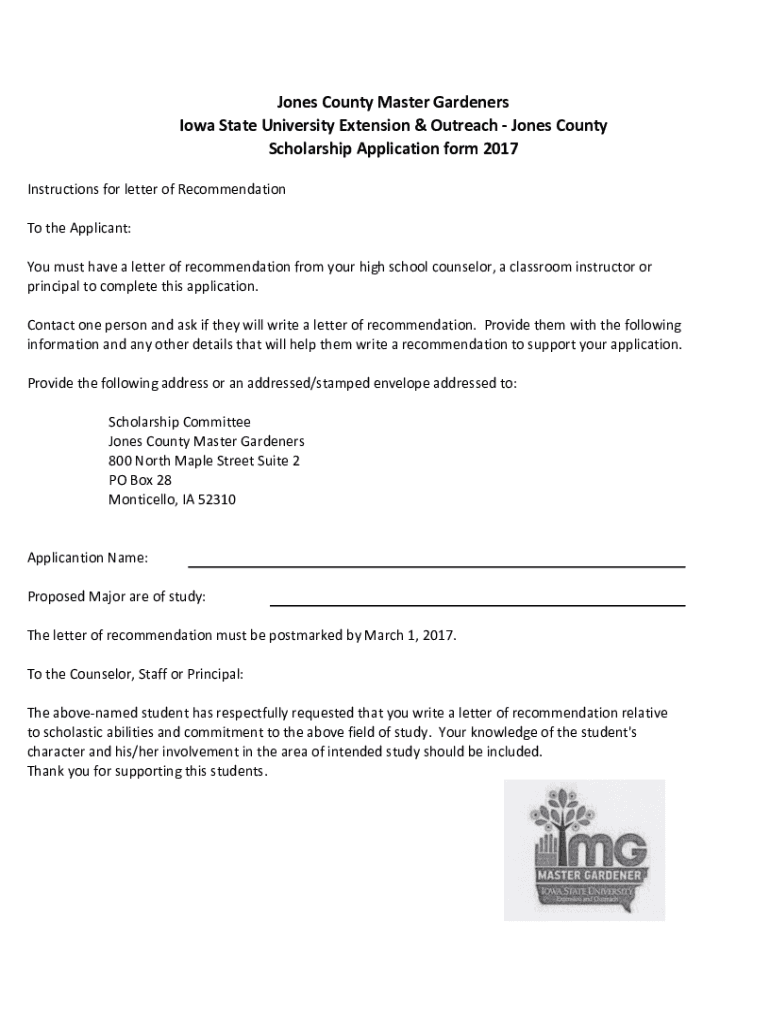 JonesCountyMasterGardeners IowaStateUniversityExtension&OutreachJonesCounty ScholarshipApplicationform2017 InstructionsforletterofRecommendation TotheApplicant: Youmusthavealetterofrecommendationfromyourhighschoolcounselor,