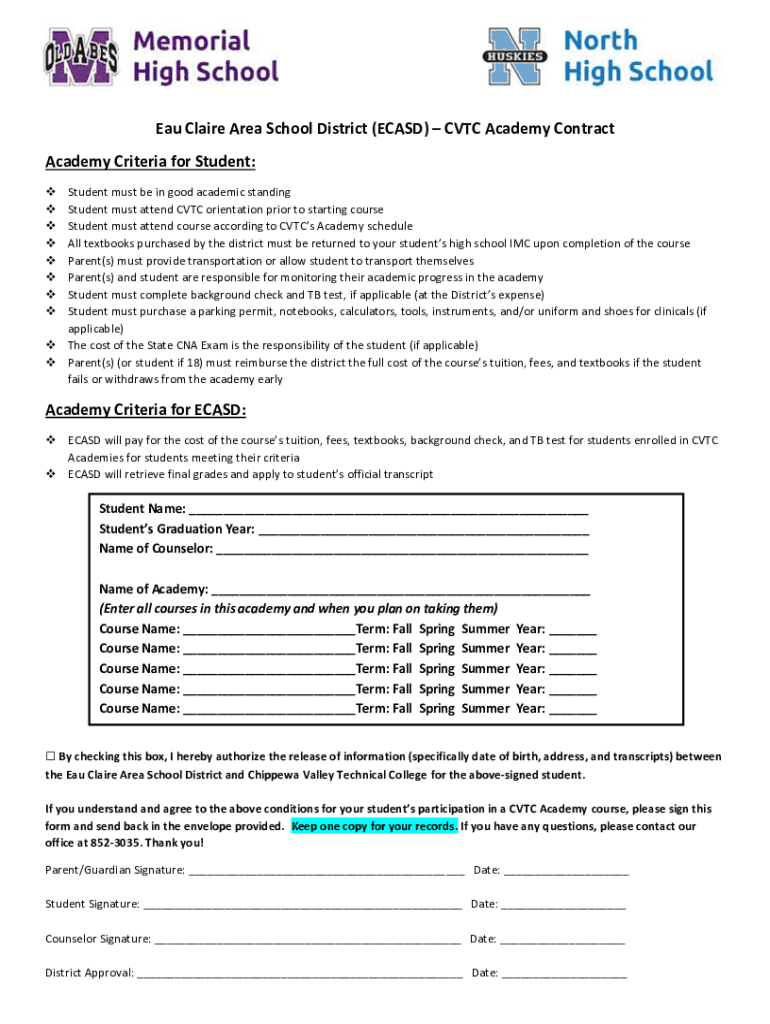 Get the free Eau Claire Area School District (ECASD) CVTC Academy Contract