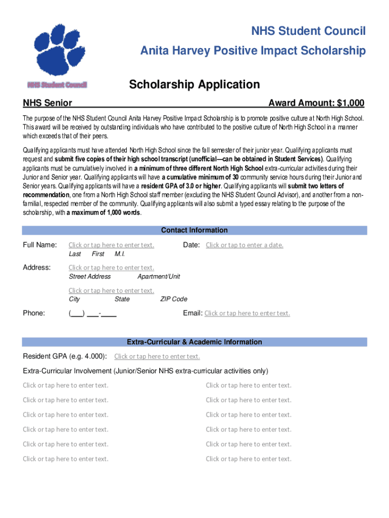 NHS Student Council Anita Harvey Positive Impact Scholarship Application NHS SeniorAward Amount: $1,000The purpose of the NHS Student Council Anita Harvey Positive Impact Scholarship is to promote