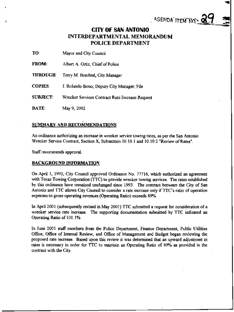 . CITY OF SAN ANTONIO INTERDEPARTMENTAL MEMORANDUM POLICE DEPARTMENT TO:Mayor and City Councilor:Albert A. Ortiz, Chief of PoliceTHROUGH:Terry M. Bechtel, City ManagerCOPIES:J. Roland0 Bono; Deputy