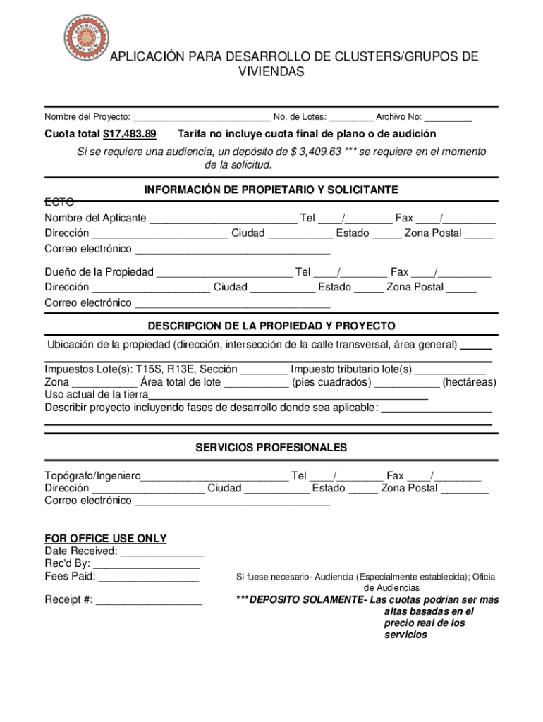 APPLICATION PARA DESARROLLO DE CLUSTERS/GRU POS DE VIVIENDASNombre Del Project: ___ No. DE Notes: ___ Archive No:Quota total $17,483.89__Tariff no include quota final de Plano o de auditions SE require