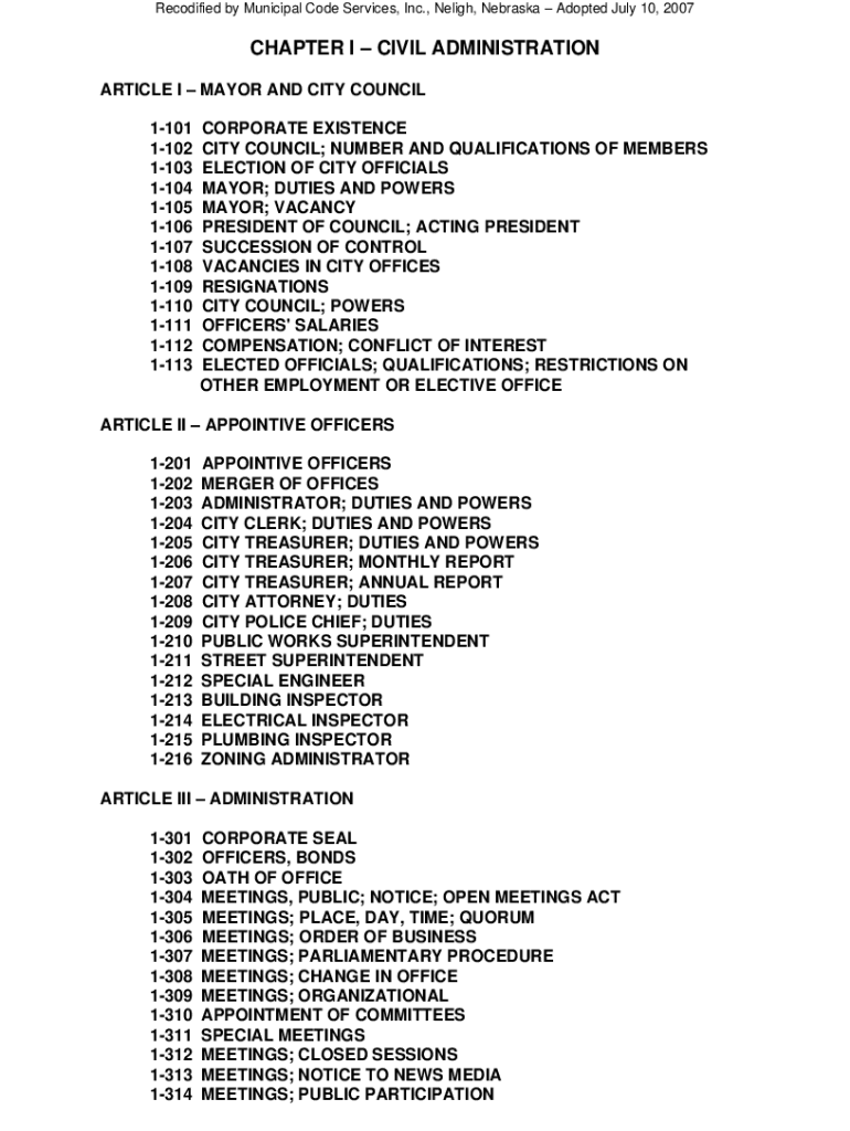 Re codified by Municipal Code Services, Inc., Neigh, Nebraska Adopted July 10, 2007CHAPTER I CIVIL ADMINISTRATION ARTICLE I MAYOR AND CITY COUNCIL 1101 1102 1103 1104 1105 1106 1107 1108 1109 1110