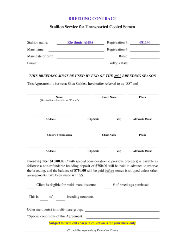 Get the free BREEDING CONTRACT Stallion Service for Transported Cooled ...