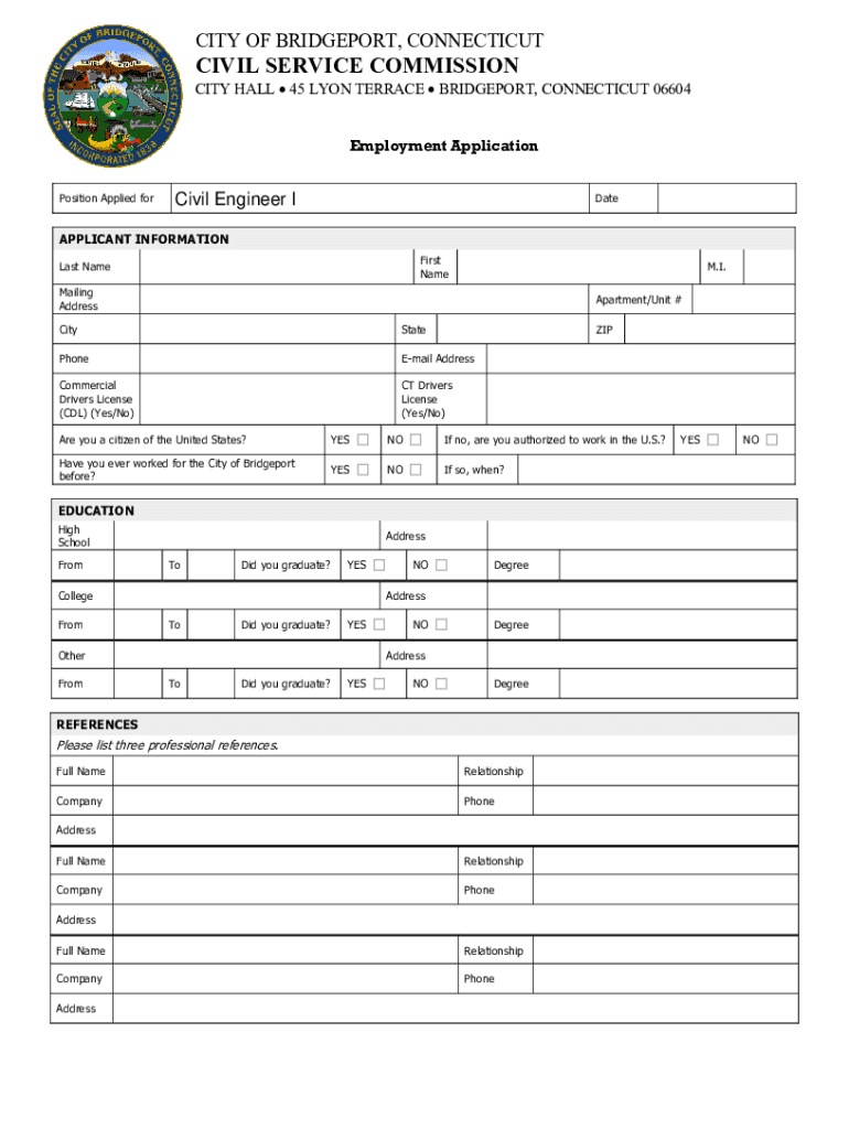 CITY OF BRIDGEPORT, CONNECTICUT The City of Bridgeport, CT is now accepting submissions for the position of CIVIL ENGINEER I Department of Engineering Salary and Benefits: $78,051 per year. This position