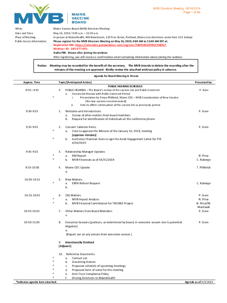 MVP Directors Meeting 05/16/2019-Page 1 of 46What: Date and Time: Place of Meeting: Public Access Information:Maine Vaccine Board (MVP) Directors Meeting May 16, 2019 / 9:00 a.m. 11:00 a.m. In person