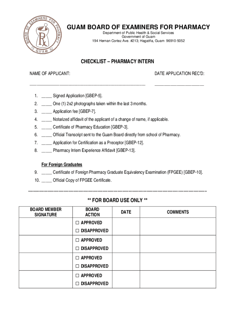 GUAM BOARD OF EXAMINERS FOR PHARMACY Department of Public Health & Social Services Government of Guam 194 Hernán Cortez Ave. #213; Height, Guam 969105052CHECKLIST PHARMACY INTERN NAME OF APPLICANT:DATE