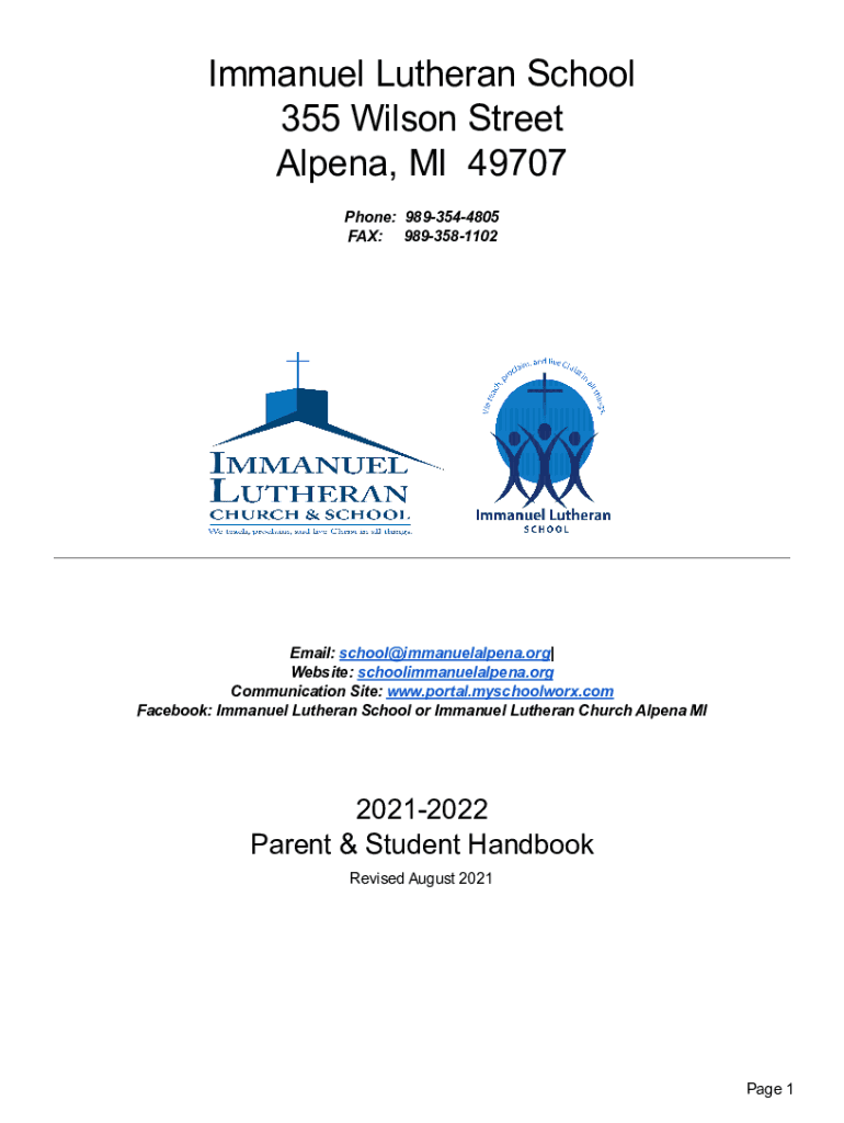 Immanuel Lutheran School 355 Wilson Street ALENA, MI 49707 Phone: 9893544805 FAX: 9893581102Email: school×immanuelalpena.org| Website: schoolimmanuelalpena.org Communication Site: www.portal.myschoolworx.com