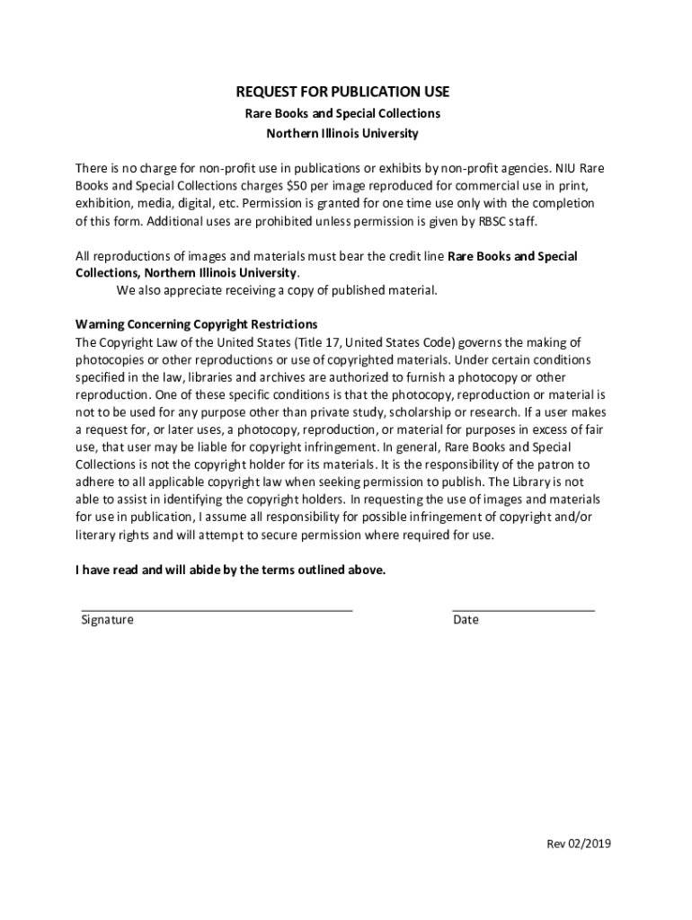 REQUEST FOR PUBLICATION USE Rare Books and Special Collections Northern Illinois University There is no charge for nonprofit use in publications or exhibits by nonprofit agencies. NIU Rare Books and