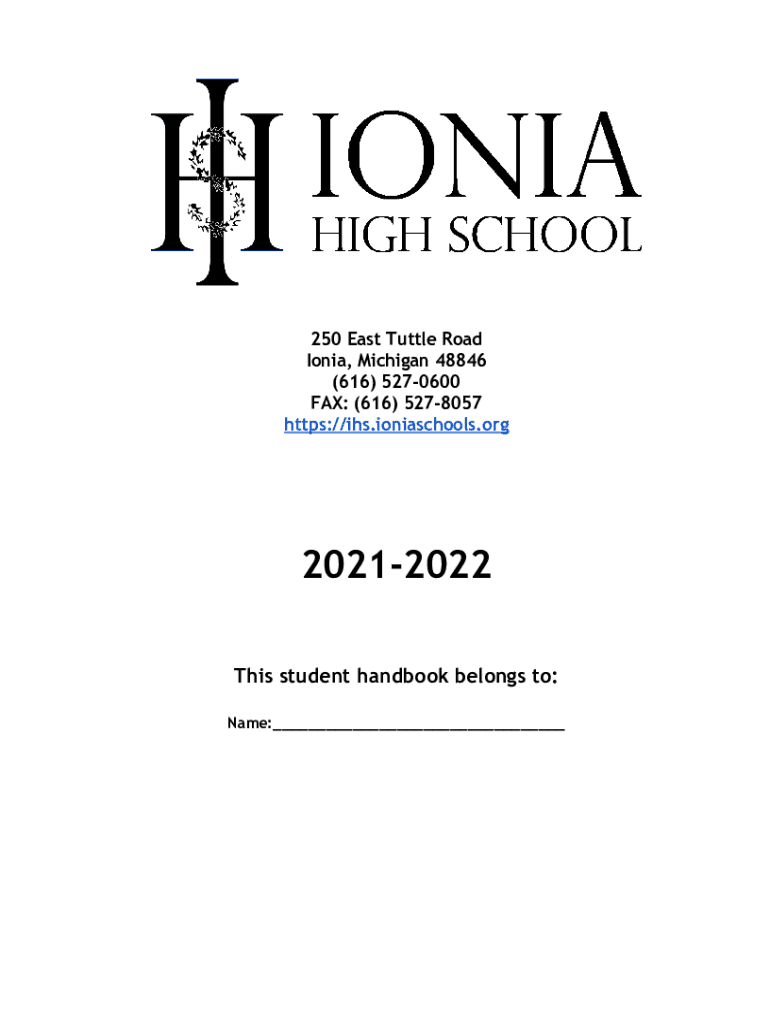 250 East Turtle Road Ionic, Michigan 48846 (616) 5270600 FAX: (616) 5278057 https://ihs.ioniaschools.org20212022 This student handbook belongs to: Name:___TABLE OF CONTENTS ALPHABETICAL Absence Reporting