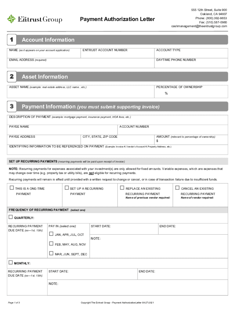 555 12th Street, Suite 900 Oakland, CA 94607 Phone: (800) 3929653 Fax: (510) 5870960 cash management×theentrustgroup.co-payment Authorization Letter 1Account Informational (as it appears on your