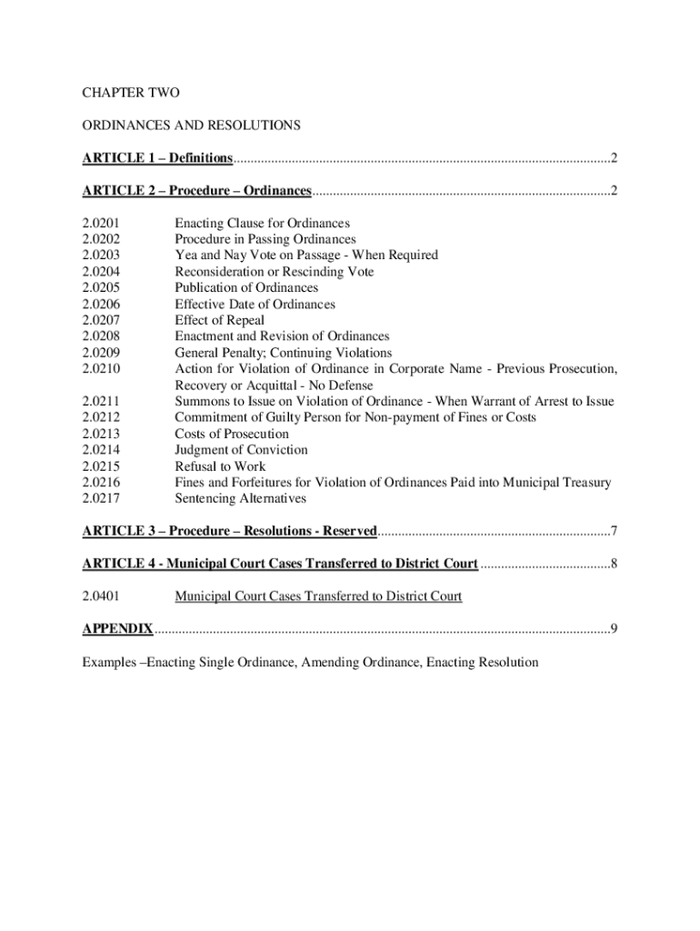 CHAPTER TWO ORDINANCES AND RESOLUTIONS ARTICLE 1 Definitions..............................................................................................................2 ARTICLE 2 Procedure Ordinances