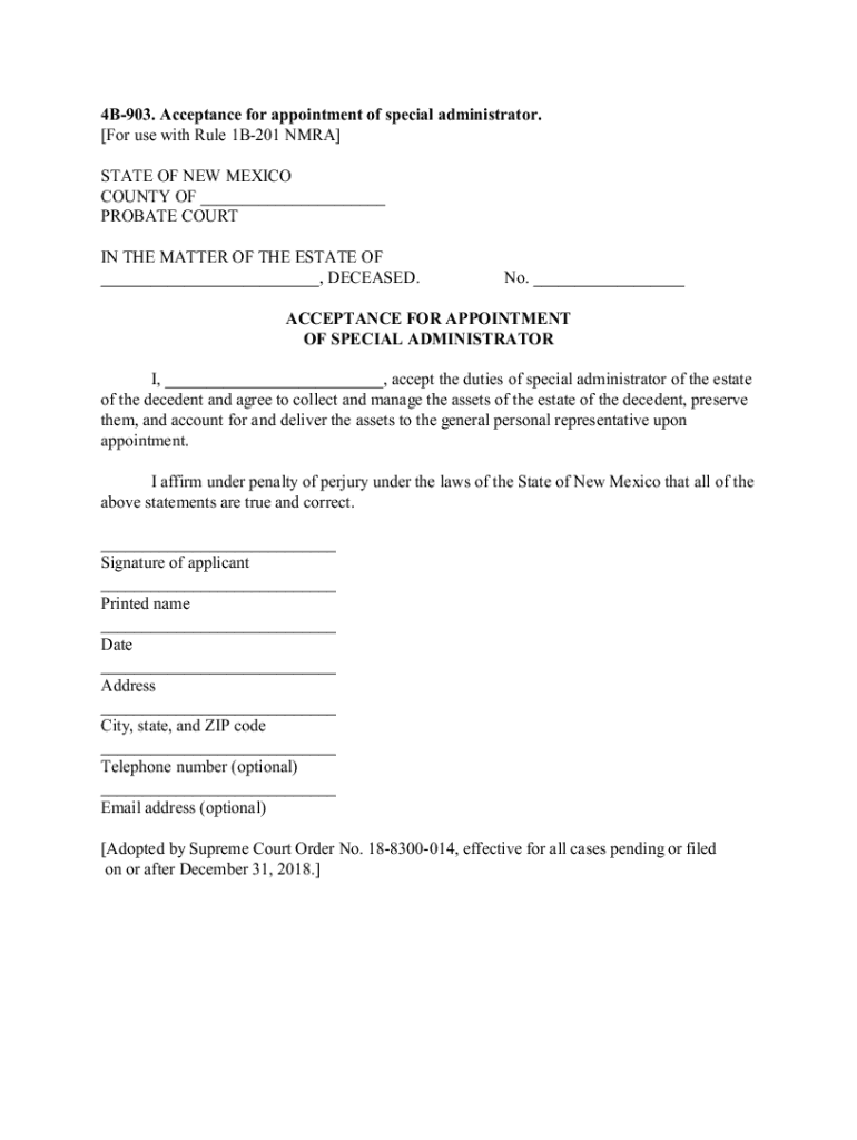 4B903. Acceptance for appointment of special administrator. [For use with Rule 1B201 NMRA] STATE OF NEW MEXICO COUNTY OF ___ PROBATE COURT IN THE MATTER OF THE ESTATE OF ___, DECEASED. No. ___ACCEPTANCE