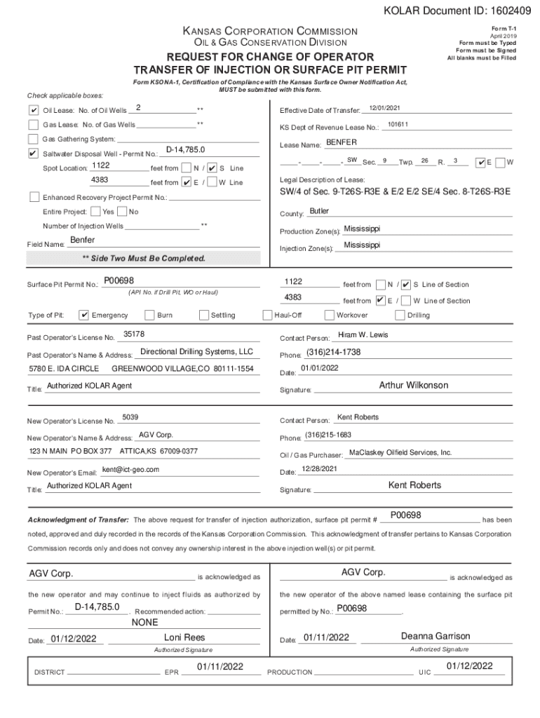 SOLAR Document ID: 1602409K KANSAS CORPORATION Commissioner T1 April 2019 Form must be Typed Form must be Signed All blanks must be Filled & GAS CONSERVATION DIVISION REQUEST FOR CHANGE OF OPERATOR