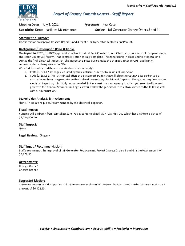 Matters from Staff Agenda Item #13Board of County Commissioners Staff Report Meeting Date: July 6, 2021, Submitting Dept: Facilities MaintenancePresenter: Paul Cote Subject: Jail Generator Change