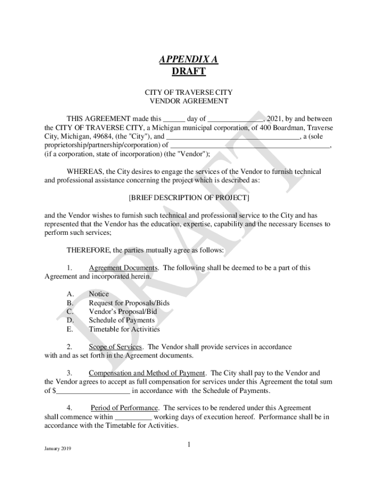 APPENDIX A DRAFT CITY OF TRAVERSE CITY VENDOR AGREEMENT THIS AGREEMENT made this ___ day of ___, 2021, by and between the CITY OF TRAVERSE CITY, a Michigan municipal corporation, of 400 Boardman,