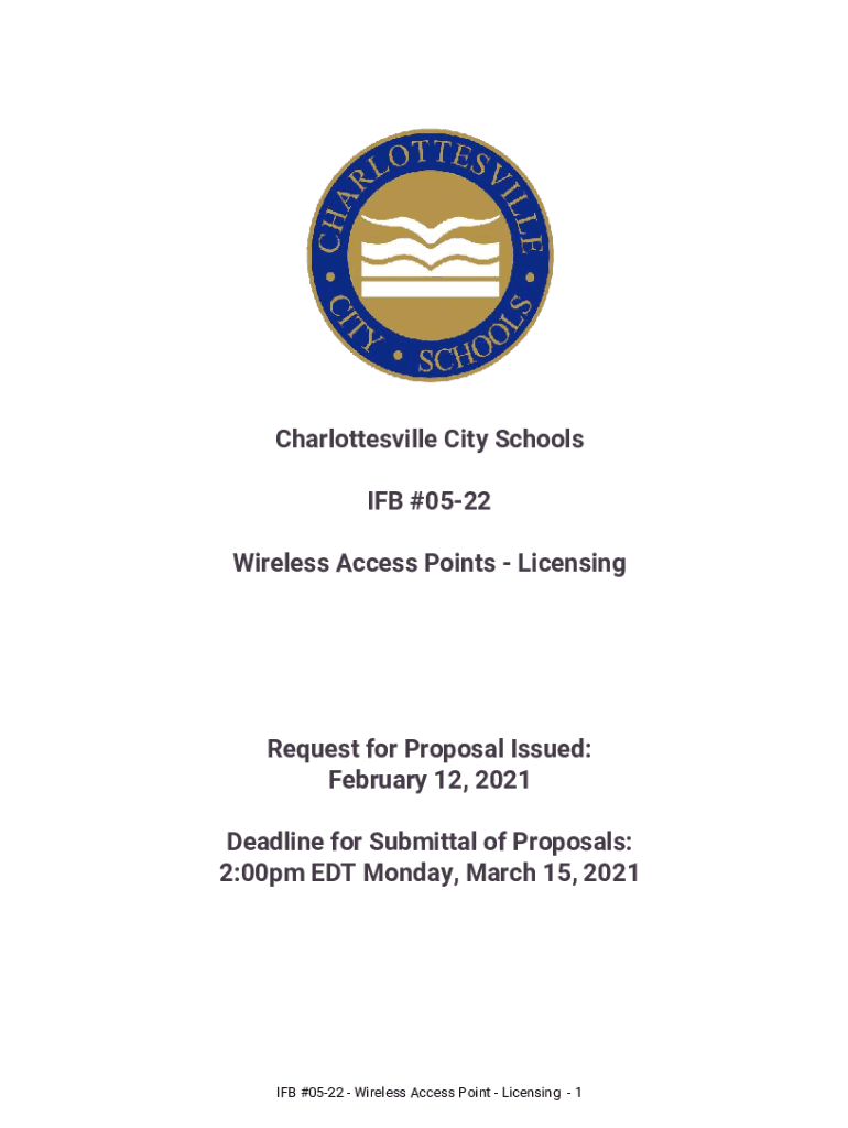 Charlottesville City Schools #0522 Wireless Access Points Licensing Request for Proposal Issued: February 12, 2021, Deadline for Submittal of Proposals: 2:00pm EDT Monday, March 15, 2021, IF #0522