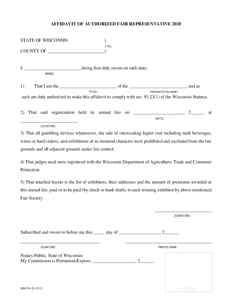 AFFIDAVIT OF AUTHORIZED FAIR REPRESENTATIVE 2020STATE OF WISCONSIN)) SS. COUNTY OF ___)I, ___, being first duly sworn on oath state: (NAME)1)That I am the ___ of the ___, and as (TITLE)(ORGANIZATION