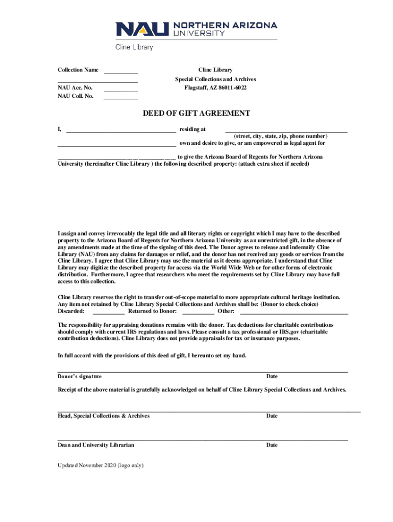 Collection Name Cline Library Special Collections and Archives Flagstaff, AZ 860116022NAU Acc. No. NAU Coll. No.DEED OF GIFT AGREEMENT I, residing at (street, city, state, zip, phone number) own and