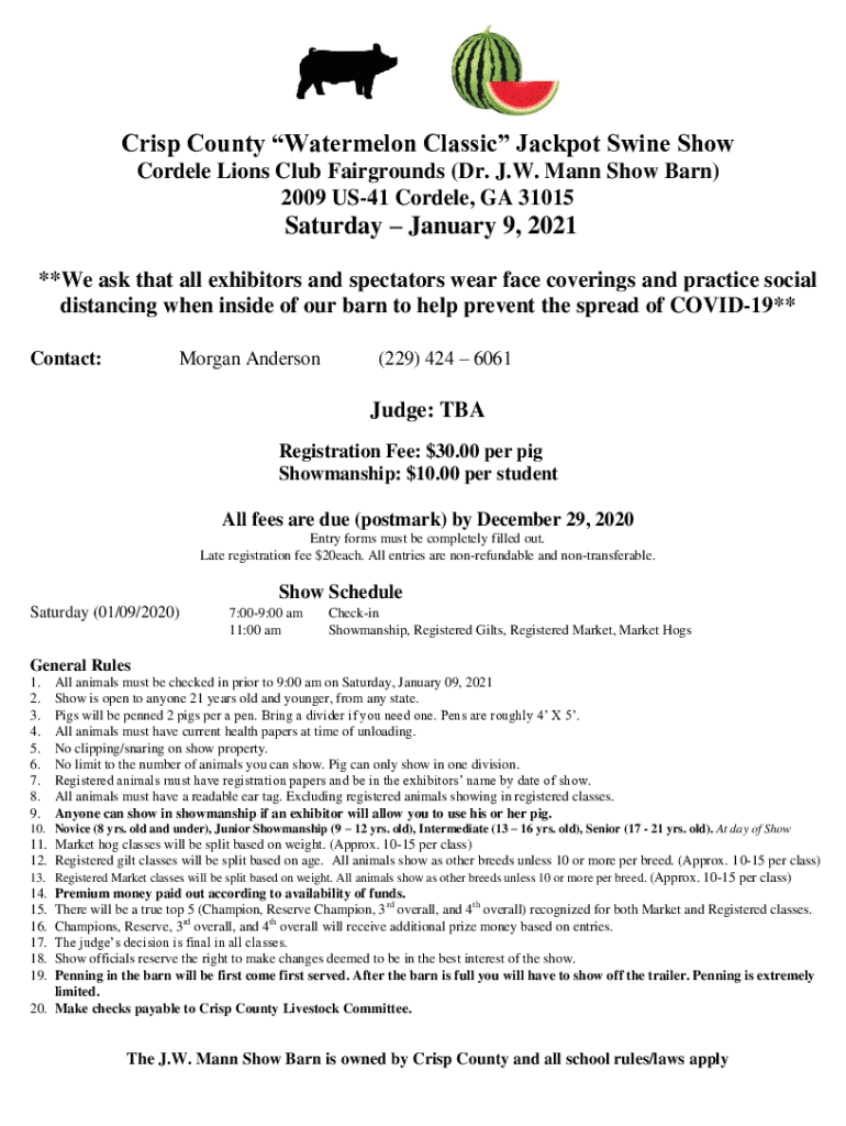 Crisp County Watermelon Classic Jackpot Swine Show Cordell Lions Club Fairgrounds (Dr. J.W. Mann Show Barn) 2009 US41 Cordell, GA 31015Saturday January 9, 2021 **We ask that all exhibitors and spectators