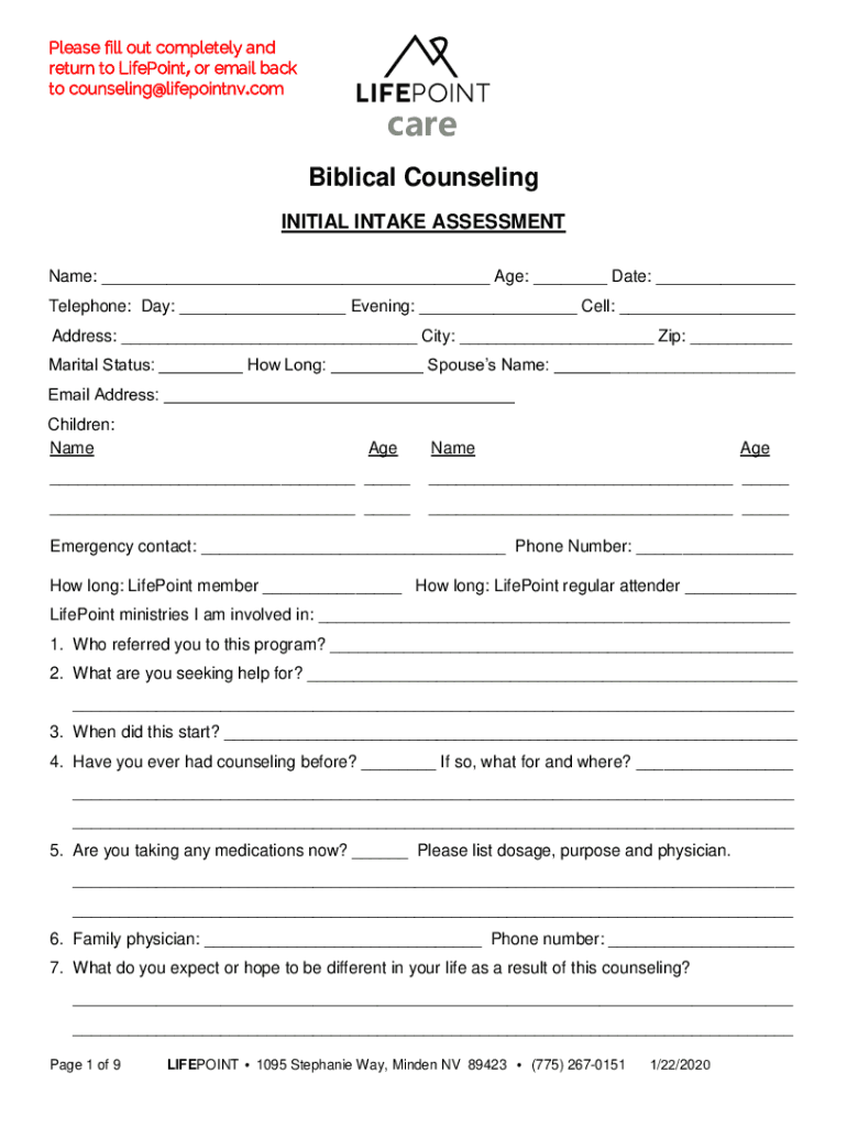 Please fill out completely and return to Lifelong, or email back to counseling×lifepointnv.compare Biblical Counseling INITIAL INTAKE ASSESSMENT Name: ___ Age: ___ Date: ___ Telephone: Day: ___ Evening: