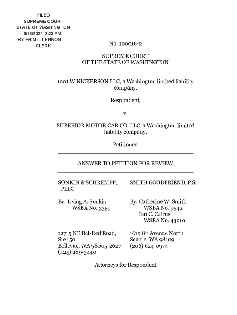 FILED SUPREME COURT STATE OF WASHINGTON 9/16/2021 2:33 PM BY ERIN L. LENNON CLERK No. 1000162SUPREME COURT OF THE STATE OF WASHINGTON ___ 1201 W NICKERSON LLC, a Washington limited liability company,