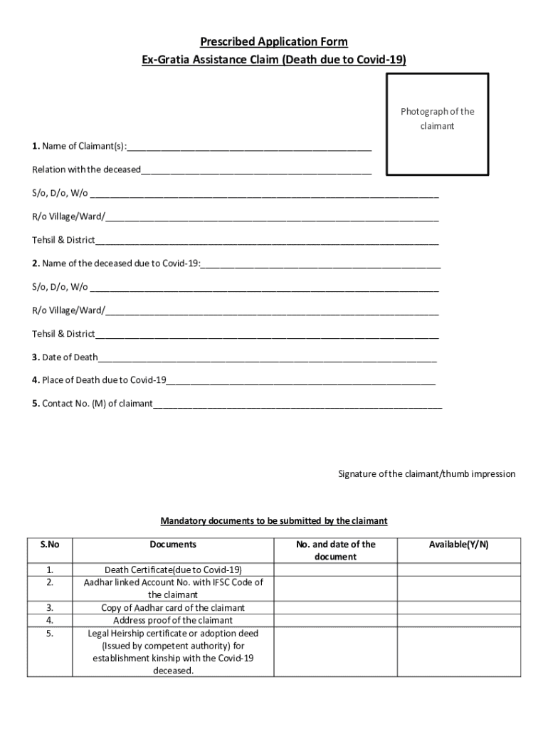 Prescribed Application Form Erratic Assistance Claim (Death due to COVID-19)Photograph of the claimant 1. Name of Claimant(s):___ Relation with the deceased___ S/o, D/o, W/o ___ R/o Village/Ward/___
