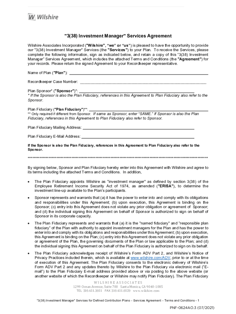 \” 3(38) Investment Manager\” Services Agreement Wilshire Associates Incorporated (\” Wilshire\”, we or us) is pleased to have the opportunity to provide our \” 3(38) Investment Manager\”