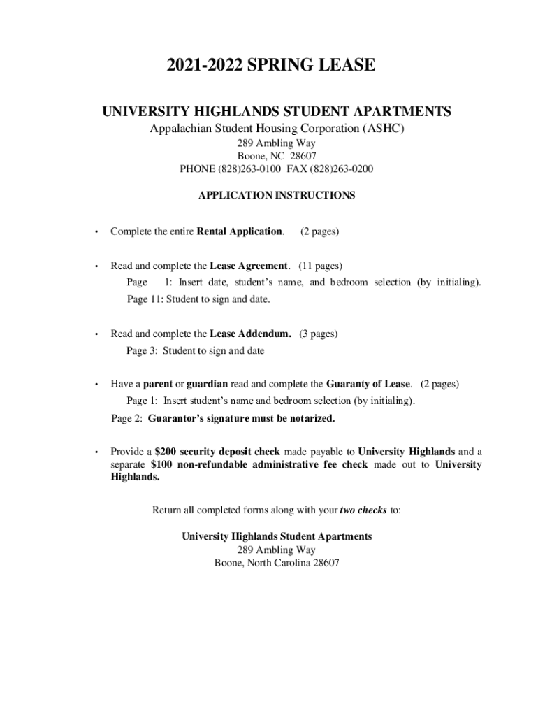20212022 SPRING LEASE UNIVERSITY HIGHLANDS STUDENT APARTMENTS Appalachian Student Housing Corporation (ASH) 289 Ambling Way Boone, NC 28607 PHONE (828)2630100 FAX (828)2630200 APPLICATION INSTRUCTIONS