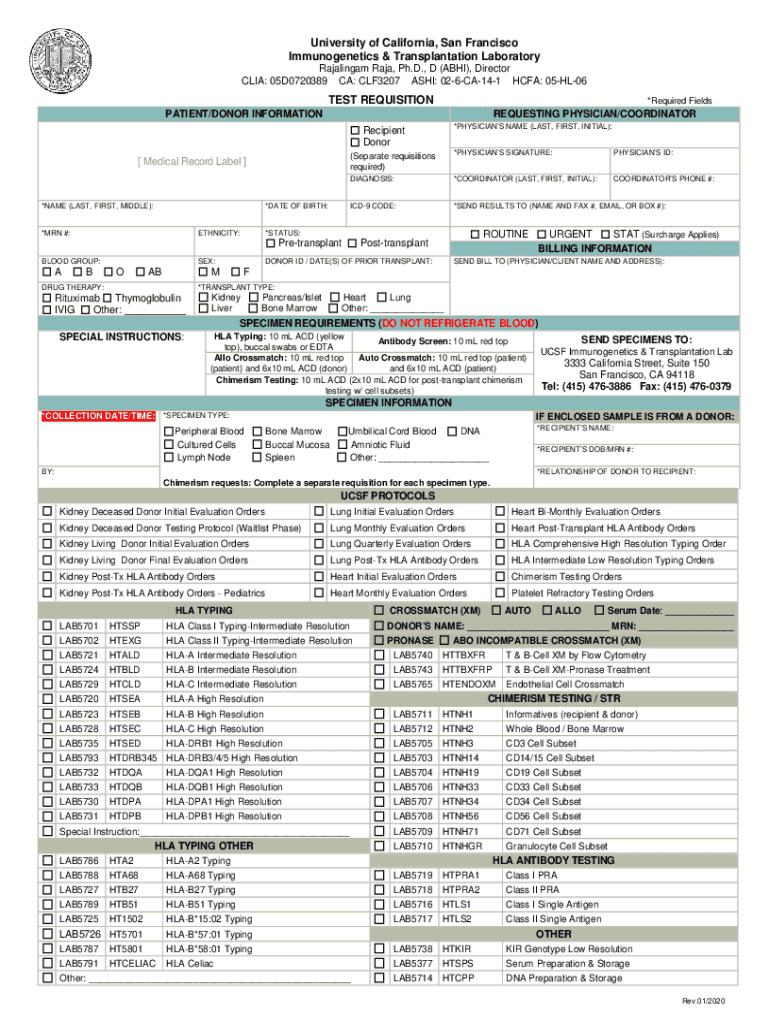 University of California, San Francisco Immunogenetics & Transplantation Laboratory Rajalingam Raja, Ph.D., D (ABH), Director CIA: 05D0720389 CA: CLF3207 ASH: 026CA141 CFA: 05HL06TEST REQUISITION×Required