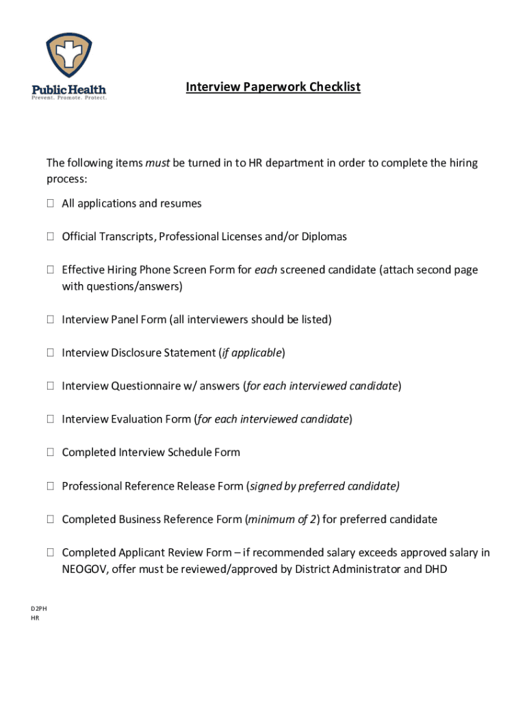 Interview Paperwork Checklist following items must be turned in to HR department in order to complete the hiring process: All applications and resumes Official Transcripts, Professional Licenses and/or