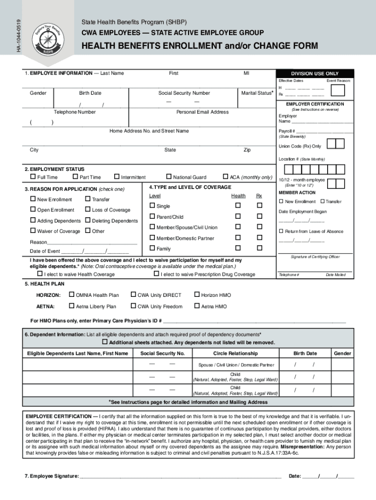 HA10440519State Health Benefits Program (SHIP)CWA EMPLOYEES STATE active employee grouphEALTH benefits enrollment and/or change form 1. EMPLOYEE INFORMATION Last NameFirstMIDIVISION USE ONLY Effective