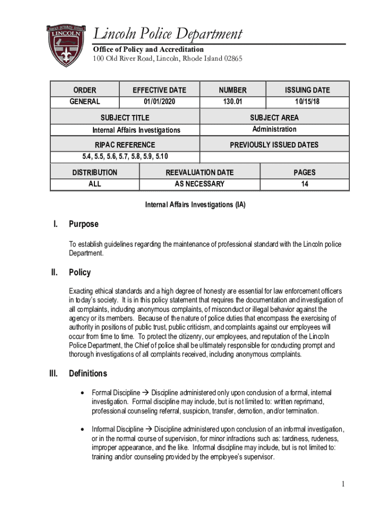 Lincoln Police Department Office of Policy and Accreditation 100 Old River Road, Lincoln, Rhode Island 02865ORDER GENERALEFFECTIVE DATE 01/01/2020NUMBER 130.01SUBJECT TITLESUBJECT AREA AdministrationInternal