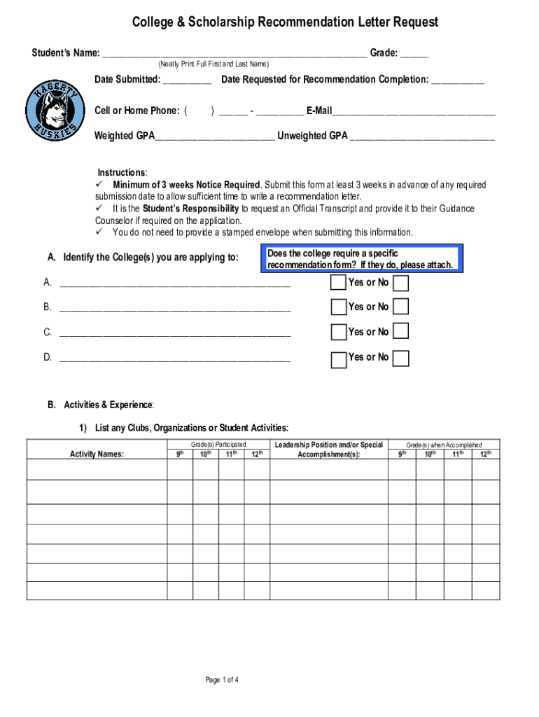 College & Scholarship Recommendation Letter Request Students Name: ___ Grade: ___ (Neatly Print Full First and Last Name)Date Submitted: ___ Date Requested for Recommendation Completion: ___ Cell
