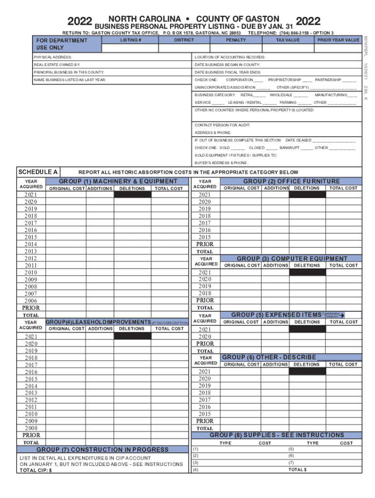 NORTH CAROLINA COUNTY OF GASTON 2022 BUSINESS 2022 PERSONAL PROPERTY LISTING DUE BY JAN. 31 LISTING #DISTRICTTELEPHONE: (704) 8663158 OPTION 3PENALTYTAX ALLOCATION OF ACCOUNTING RECORDS:REAL ESTATE