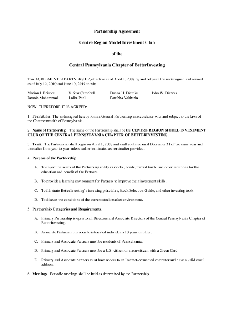 Partnership Agreement Center Region Model Investment Club of the Central Pennsylvania Chapter of BetterInvesting This AGREEMENT of PARTNERSHIP, effective as of April 1, 2008, by and between the undersigned