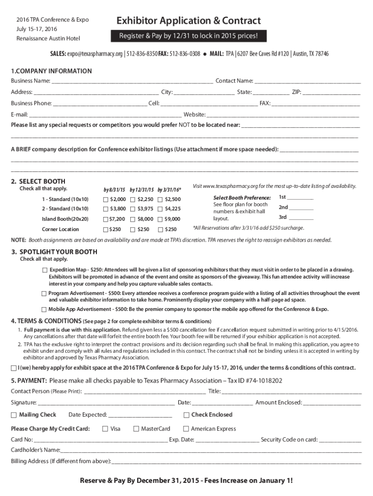 2016 TPA Conference & Expo July 1517, 2016 Renaissance Austin HotelExhibitor Application & Contract Register & Pay by 12/31 to lock in 2015 prices!SALES: expo×texaspharmacy.org | 5128368350 Faxes: