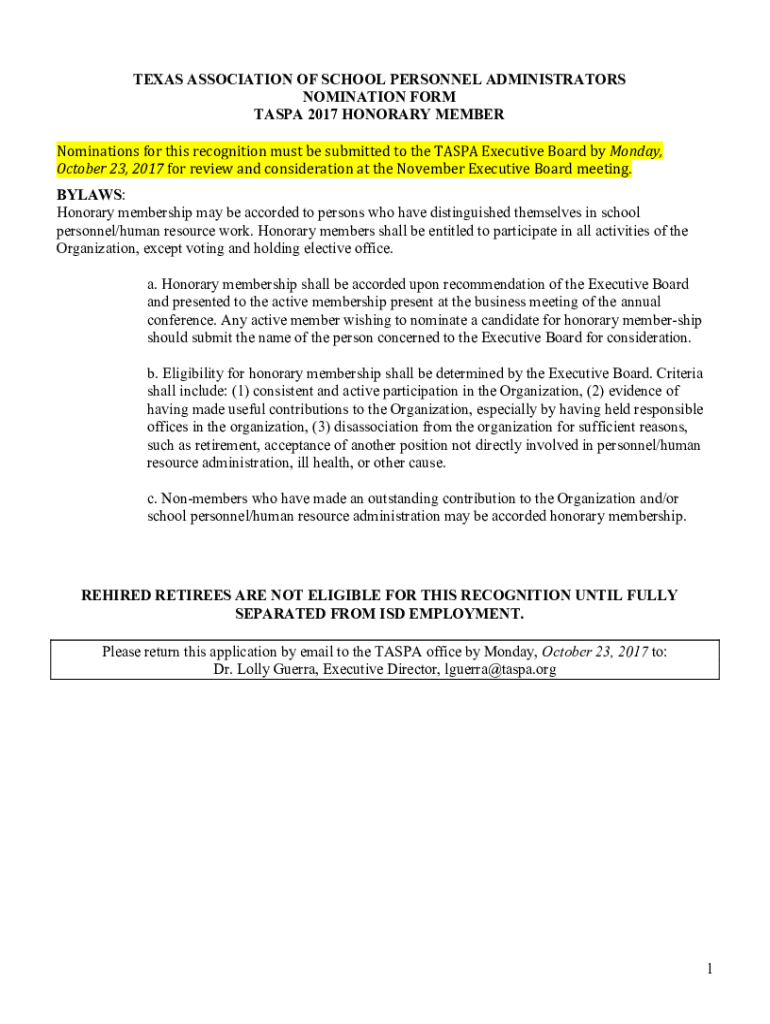 TEXAS ASSOCIATION OF SCHOOL PERSONNEL ADMINISTRATORS NOMINATION FORM TAMPA 2017 HONORARY MEMBER Nominations for this recognition must be submitted to the TAMPA Executive Board by Monday, October 23,