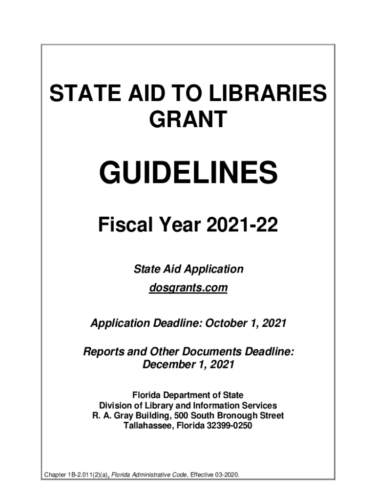 STATE AID TO LIBRARIES GRANTQ0BGUIDELINES1BFiscal Year 202122 2BState Aid Application dosgrants.com Application Deadline: October 1, 2021, Reports and Other Documents Deadline: December 1, 2021, Florida