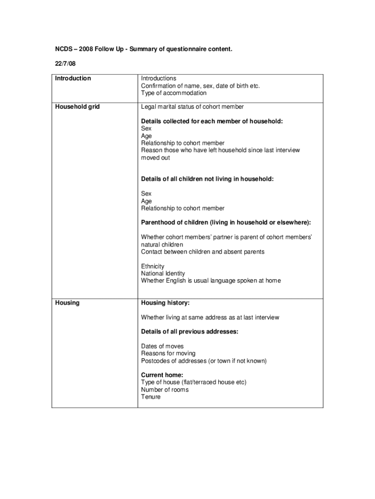 Get the free NCDS Final Questionnaire - Summary of content for web.doc