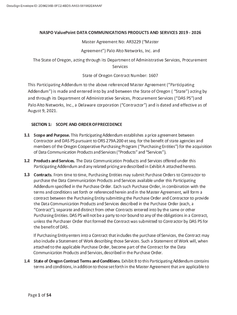 DocuSign Envelope ID: 2D84236B0FC24BD5AA53561982E4AAAFNASPO Bluepoint DATA COMMUNICATIONS PRODUCTS AND SERVICES 2019 2026 Master Agreement No: AR3229 (Master Agreement) Palo Alto Networks, Inc. and