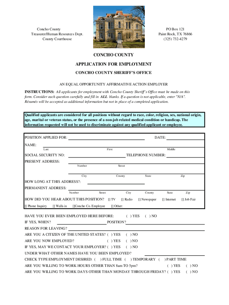 Conch County Treasurer/Human Resources Dept. County Courthouse PO Box 121 Paint Rock, TX 76866 (325) 7324279CONCHO COUNTY APPLICATION FOR EMPLOYMENT CONCH COUNTY SHERIFFS OFFICE AN EQUAL OPPORTUNITY